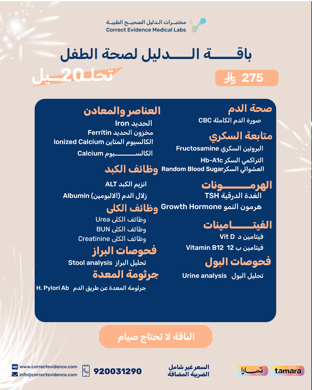 صحة طفلك هي أولويتك، وحرصك على الاطمئنان عليها خطوة مهمة في كل مرحلة من مراحل النمو. باقة الدليل لصحة الطفل تقدم مجموعة من التحاليل الأساسية التي تتيح لك تقييم شامل لوظائف الجسم، ومستويات الفيتامينات، والعناصر الغذائية التي يحتاجها الطفل للنمو السليم والنشاط اليومي.