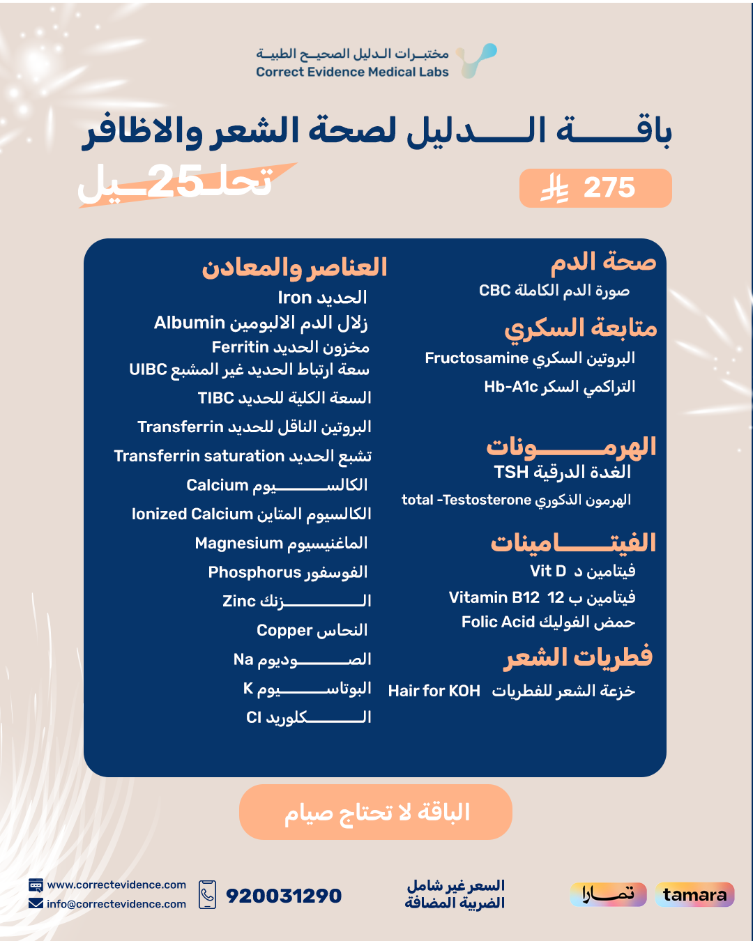 باقة الدليل لصحة الشعر والاظافر توفر لك تحليلًا شاملاً يساعد على الكشف عن الأسباب الداخلية التي تؤثر على صحة الشعر وقوّة الأظافر، من نقص المعادن أو اضطراب الهرمونات أو خلل في امتصاص الفيتامينات.