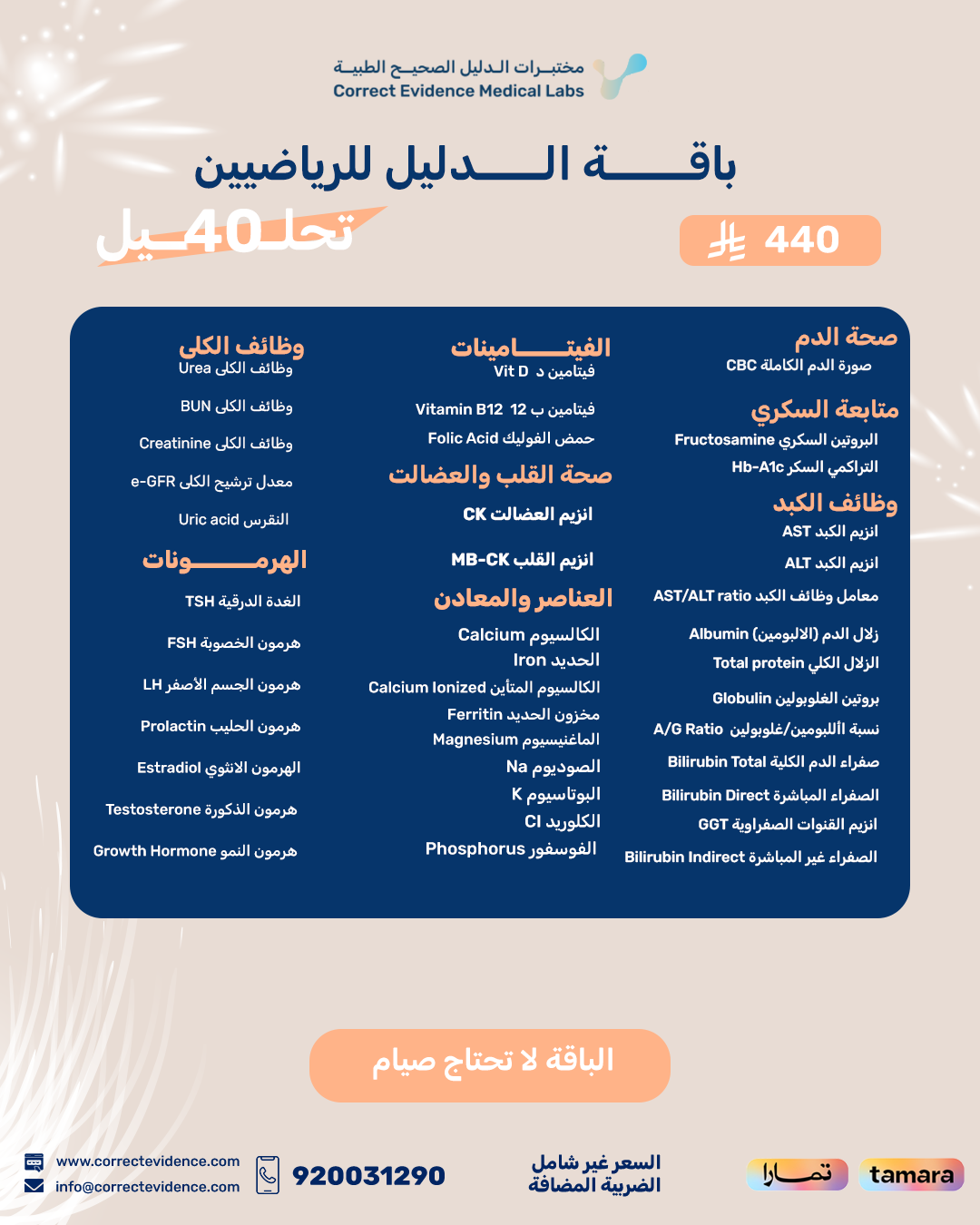 تم تصميم باقة الرياضيين خصيصًا للرجال والنساء الذين يمارسون الرياضة بكثافة، أو يتبعون أنظمة تدريبية تهدف لبناء العضلات، زيادة اللياقة، أو خسارة الدهون. تضم الباقة 40 تحليلًا أساسيًا تشمل صحة الدم، الهرمونات، وظائف الكلى والكبد، صحة القلب والعضلات، العناصر والمعادن، والفيتامينات. وكلها عوامل مباشرة تؤثر على أدائك الرياضي.