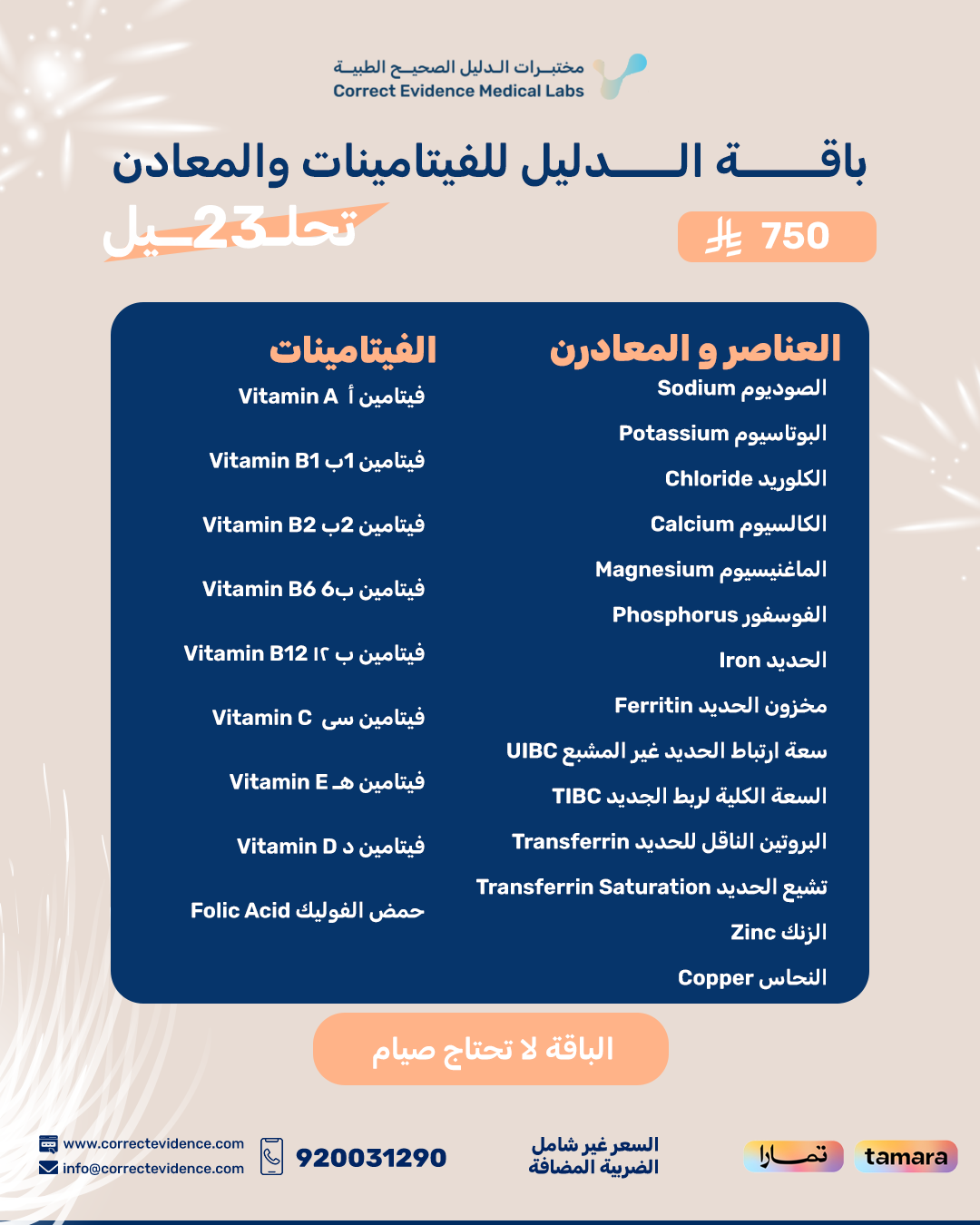 ابدأ الآن بفحص شامل ودقيق مع باقة الدليل للفيتامينات والمعادن واستعد طاقتك وصحتك.