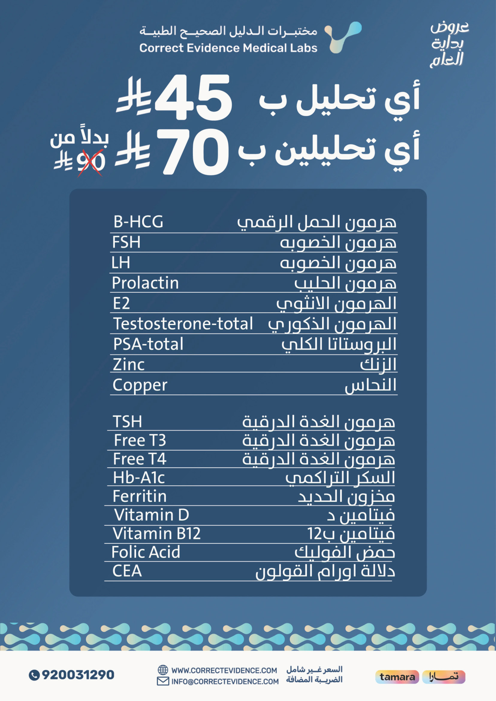 عرض التوفير: اختر أي تحليل من القائمة بـ 45 ريال، أو احصل على تحليلين بسعر مخفض 70 ريال (بدلاً من 90 ريال). تشمل القائمة الهرمونات، الفيتامينات، الغدة الدرقية، ومخزون الحديد.